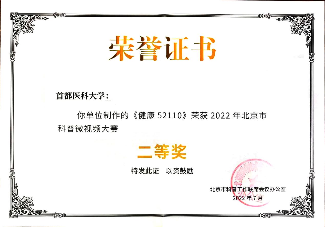 近日,由北京市科学技术委员会组织开展的“2022年北京市科普微视频大赛”评选活动落下帷幕,我院“小学生健康教育课题”组谢立璟、龙鑫等教师创作的健康教育作品《健康52110》获得大赛二等奖。