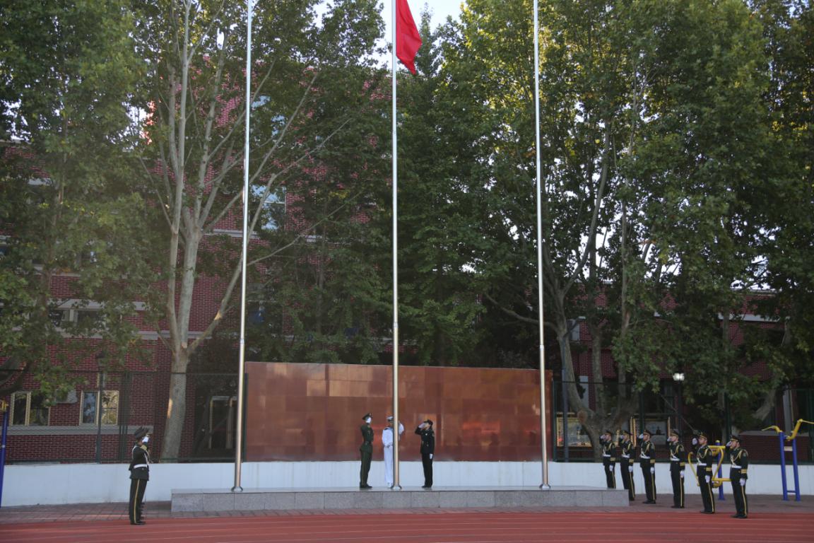 10月8日,绅士漫画 2019级全体军训学生在操场举行升国旗仪式。绅士漫画 党委书记吴兵、院长杨红、党委副书记、军训团副政委崔群颖、军训团其他教师和610余名大一新生共同参加了升国旗仪式。