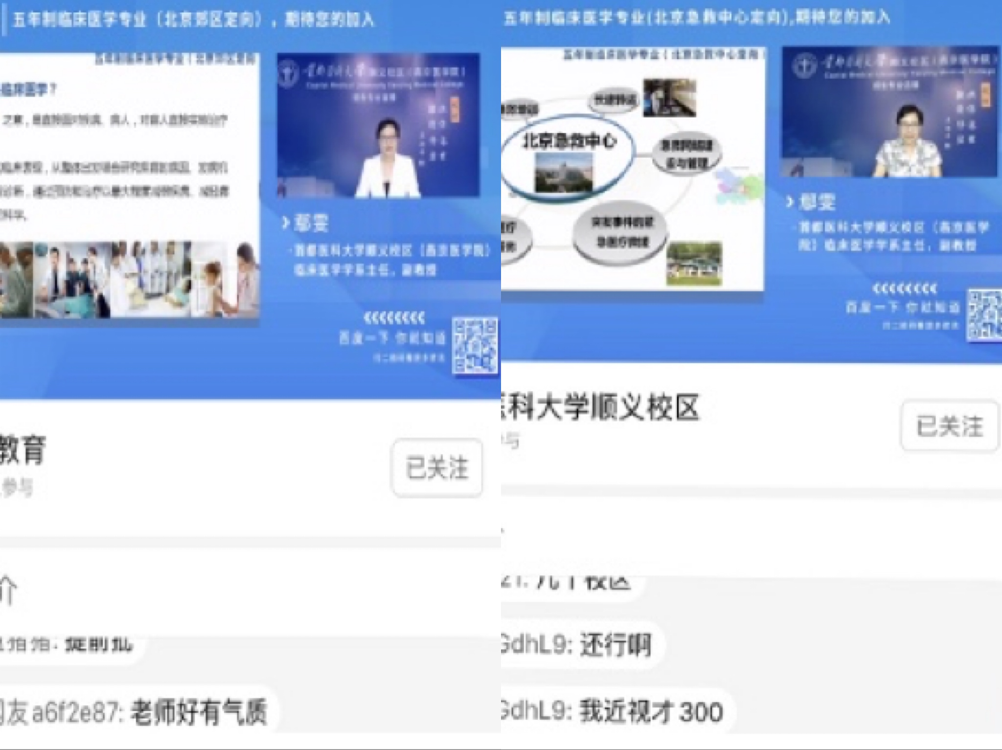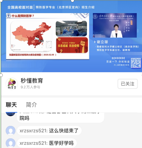 临床医学学系主任鄢雯副教授通过两场直播宣讲就考生及家长关注的专业情况和招生政策从专业特色、课程体系、学科优势、人才培养模式、教学成果、就业情况和专业招生政策等方面对五年制临床医学专业(北京郊区定向)和五年制临床医学专业(北京急救中心定向)进行了全面深入地分析,充分展示了绅士漫画 的办学理念、办学特色、办学成果和办学实力,帮助考生们全面了解专业定位、培养目标、培养模式、专业建设成效和专业特色,以及作为定向专业,其招生和就业政策的特殊性,让广大考生网友们“亲临其境”地感受到绅士漫画 风采。