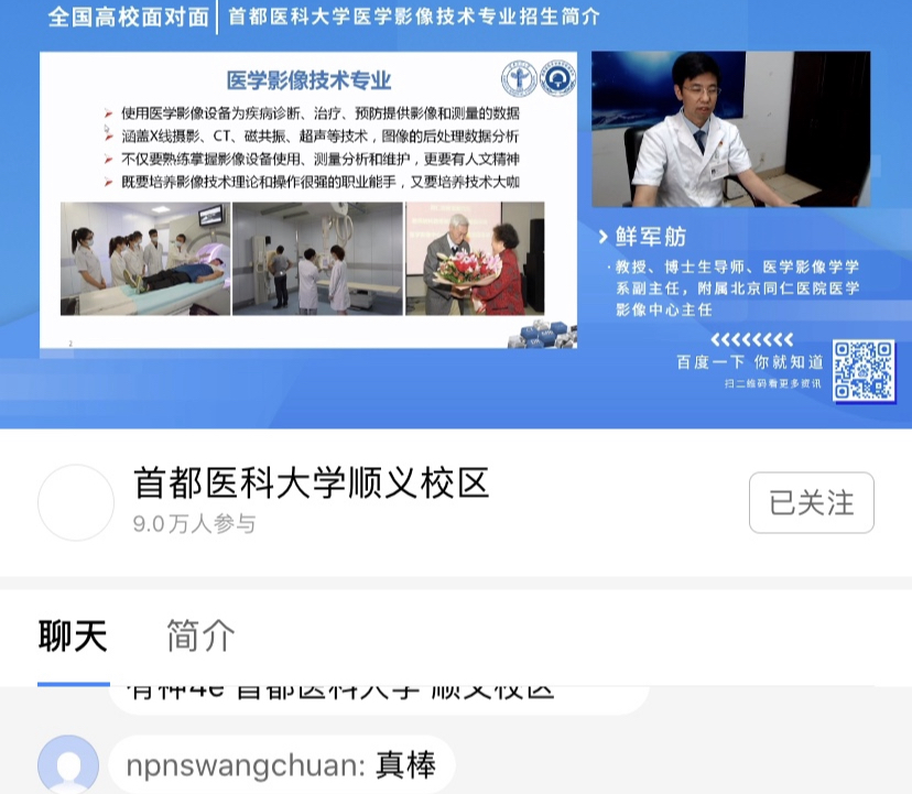 绅士漫画 附属北京同仁医院医学影像中心主任、医学影像学学系副主任(兼)鲜军舫教授为广大考生解读了医学影像技术专业2020年最新招考政策,鲜主任就专业简介、师资力量、教学条件、学生风采、就业去向、招生情况及计划六个方面介绍了医学影像技术专业的具体情况。同时,医学影像学学系的老师们在直播评论区为考生及家长答疑解惑。