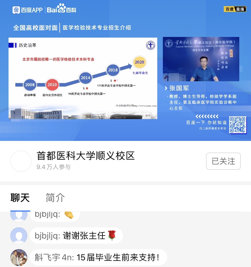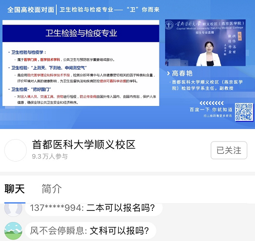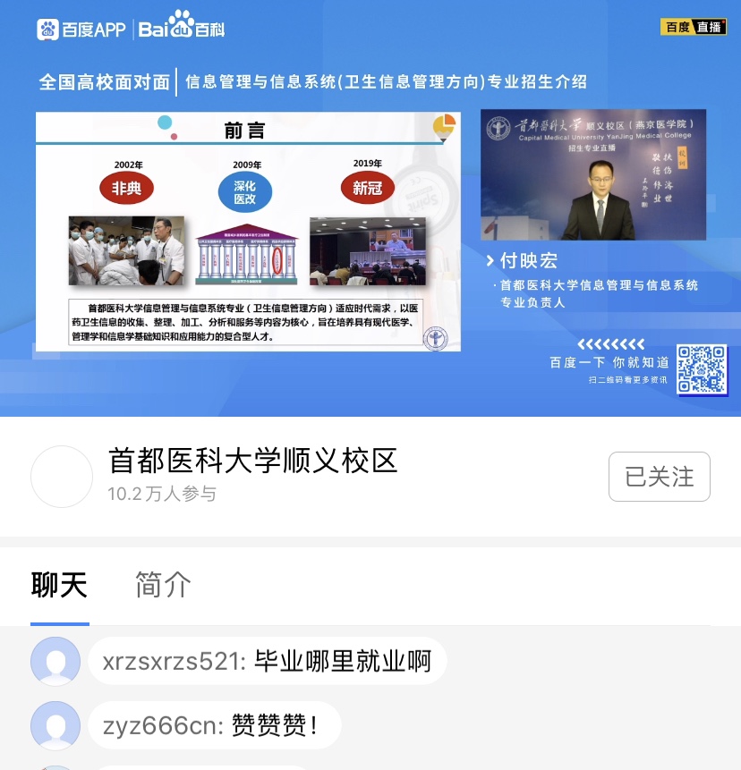 疫情特殊时期,我院应势而谋,把握网络媒体宣传主要阵地,通过网络直播宣讲的方式,积极宣传推介绅士漫画 7个本科专业,突出专业内涵,吸引优秀生源。期待更多学子踏入医学殿堂,助力人民健康,为健康中国健康北京贡献力量。