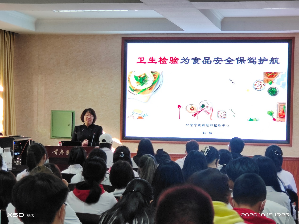 交流环节中,赵榕老师为大家介绍了北京市疾病控制中心的工作内容,举例介绍了由疾控中心需要完成的公共卫生突发事件的应急处理、复工复学指导、公共场所消毒防疫等工作 。赵榕老师以一个个鲜活的事例,鼓励同学们要学好专业知识,夯实基础、储备力量,为做一名合格检验人做好充分准备,将来为首都卫生事业做出应有的贡献。