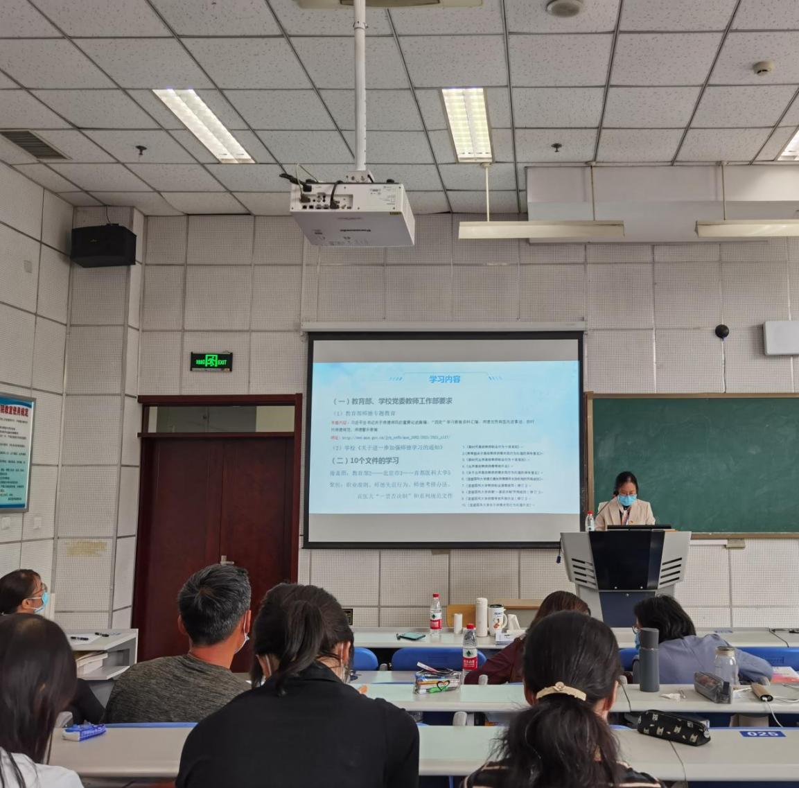 之后,学系党支部副书记王世全、专职辅导员蓝翠柳带领全系教师系统学习了中共中央、北京市委、教育部关于新时代教师队伍建设、师德建设等相关文件及我校关于师德建设、职业道德规范等制度文件。