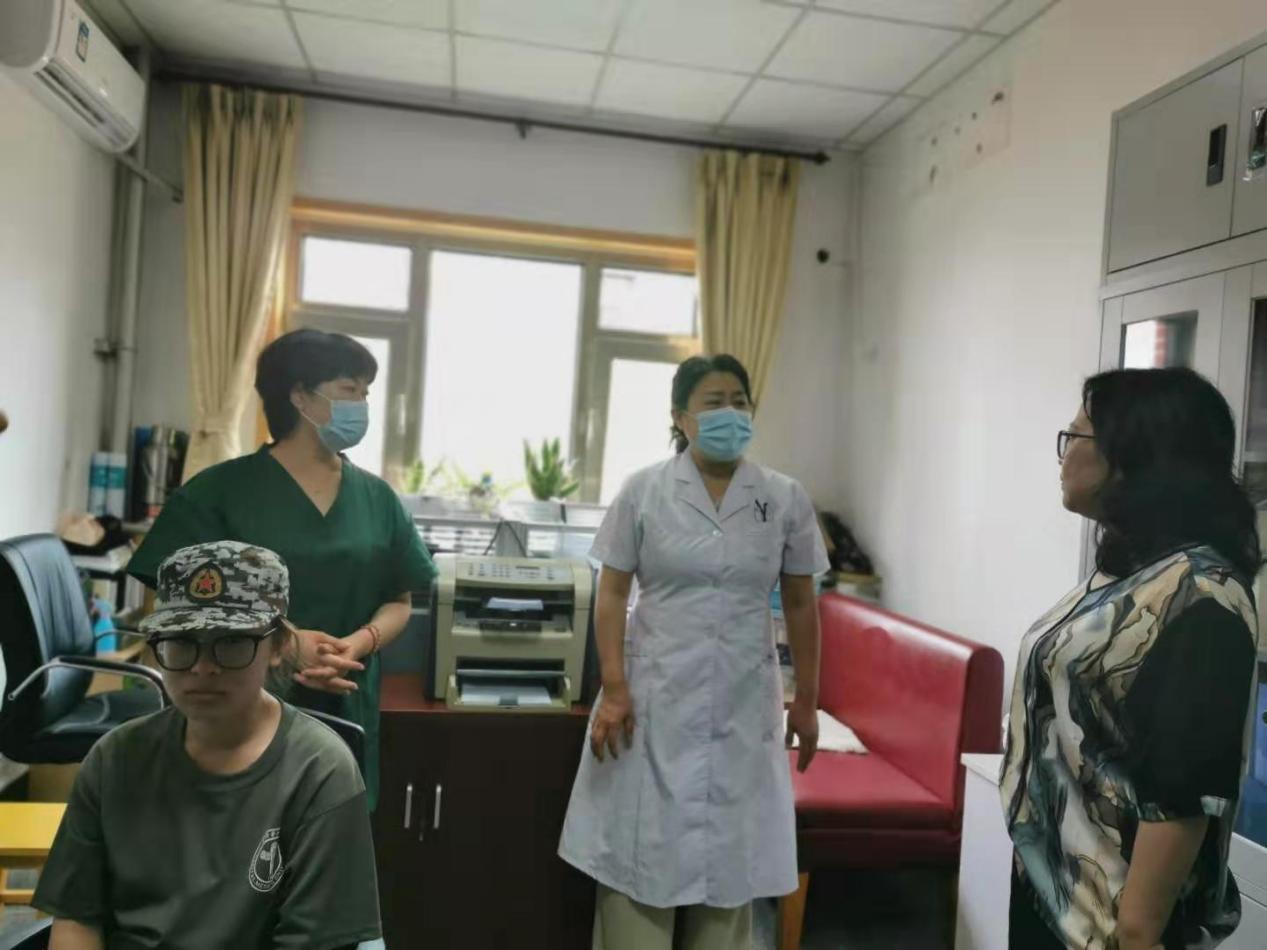 最后,刘芳副书记一行来到卫生健康室看望伤病学生,与学生和健康室老师亲切交谈,了解学生身体状况与健康室老师军训期间工作情况。