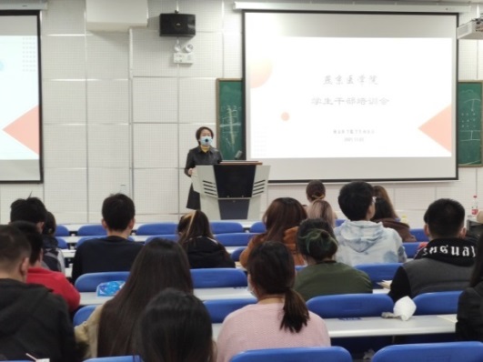 学生骨干培训主要包括学生党建、团支部建设、日常事务办理等内容。首先,沈悦老师从学生党支部管理经验入手,指出学生干部“打铁还需自身硬”,应努力提升自我修养,将老师要求化为主动创新,深入同学,发动班级成员发挥自身优势,合力做好班级工作。常征老师从团支部建设的角度分享体悟,强调团干部将团日活动创新性、团务工作规范化等作为工作重点,通过团建促党建;此外,以创新创业大赛为例,鼓励大家借助自身专业优势,打开眼界,放宽思维,积极参赛,不断提升自身能力。修晓林老师从奖学金申请、困难生认定等工作,强调班干部在工作中要多自省、勤沟通、常思考、重团结、树威信,结合班干部工作常遇到的问题进行了分享。最后,薛乔丹老师以建立“青春成长故事会”工作室为例,介绍如何利用多媒体的形式发动学生力量,吸引同学关注,提升班级凝聚力,为班级建设提供新思路。