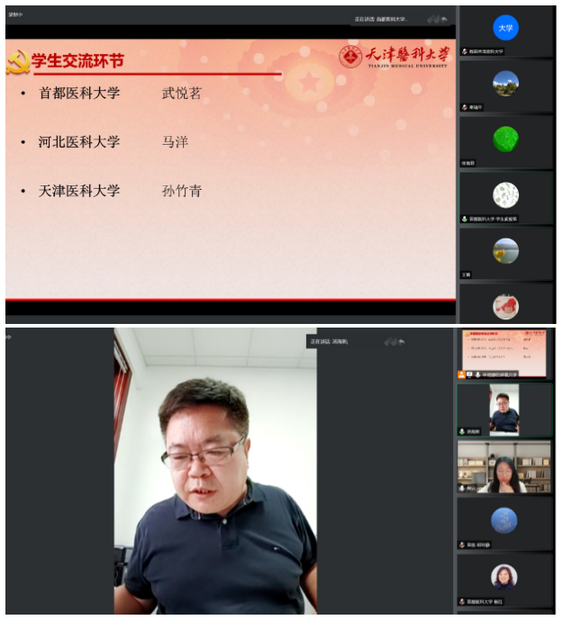 学生交流环节,武悦茗、马洋、孙竹青分别代表三校学生发言,他们从学生的角度出发,赞扬了三位老师润物无声的思政元素教学,并交流了对思政课堂的看法。他们一致认为,对于医学生而言,课程思政不仅能引导同学们树立正确的三观,更能培养出严谨、包容、谦逊的工作作风和扶伤济世、敬德修业的高尚情操和人道主义精神。