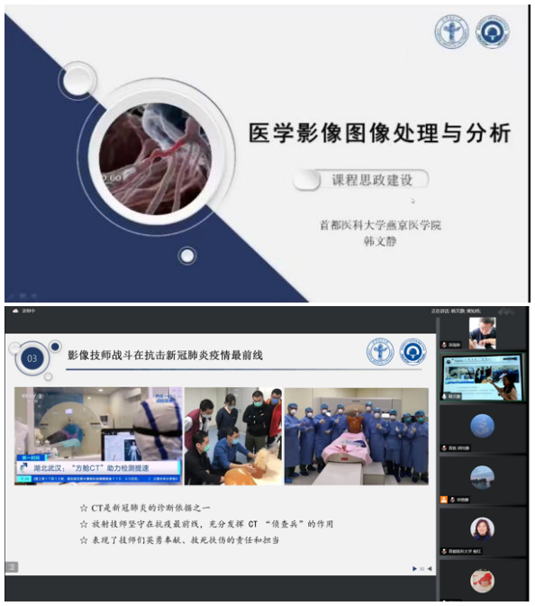 我院医学影像学学系韩文静老师、河北医科大学医学影像绅士漫画 程莉老师、天津医科大学医学技术绅士漫画 王者香老师作为教师代表进行了课程思政展示。他们的课程,思政育人贯穿整个授课过程,旨在培养学生的终身学习能力,树立严谨的科学态度、创新意识以及团队合作精神,坚定学生们的大国工匠精神、医者仁心的大爱意识和为人类健康奋斗的远大理想,在传授知识的过程中,进行能力培养和价值塑造。