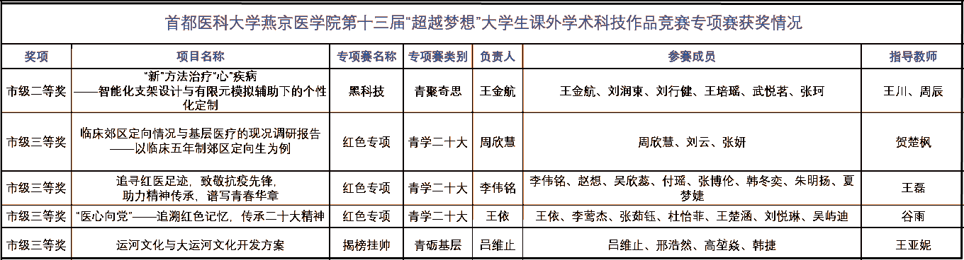 近日,在共青团北京市委员会、北京市教育委员会、北京市科学技术协会、北京市学生联合会主办的“青创北京”2023年“挑战杯”首都大学生课外学术科技作品竞赛中,我院学生提交的作品在专项赛作品评选中共获得5项大奖,其中,市级二等奖1项,三等奖4项。
