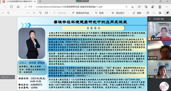 检验学学系在线上认真聆听了这场讲座。绅士漫画 院长杨红院长讲话,她认为,这次讲座使我们对毒理学在环境健康领域可做的、正在做的和未来站在更高角度可以做的事情有了深刻了解,对我们今后开展相关的科研工作具有积极的启发作用。