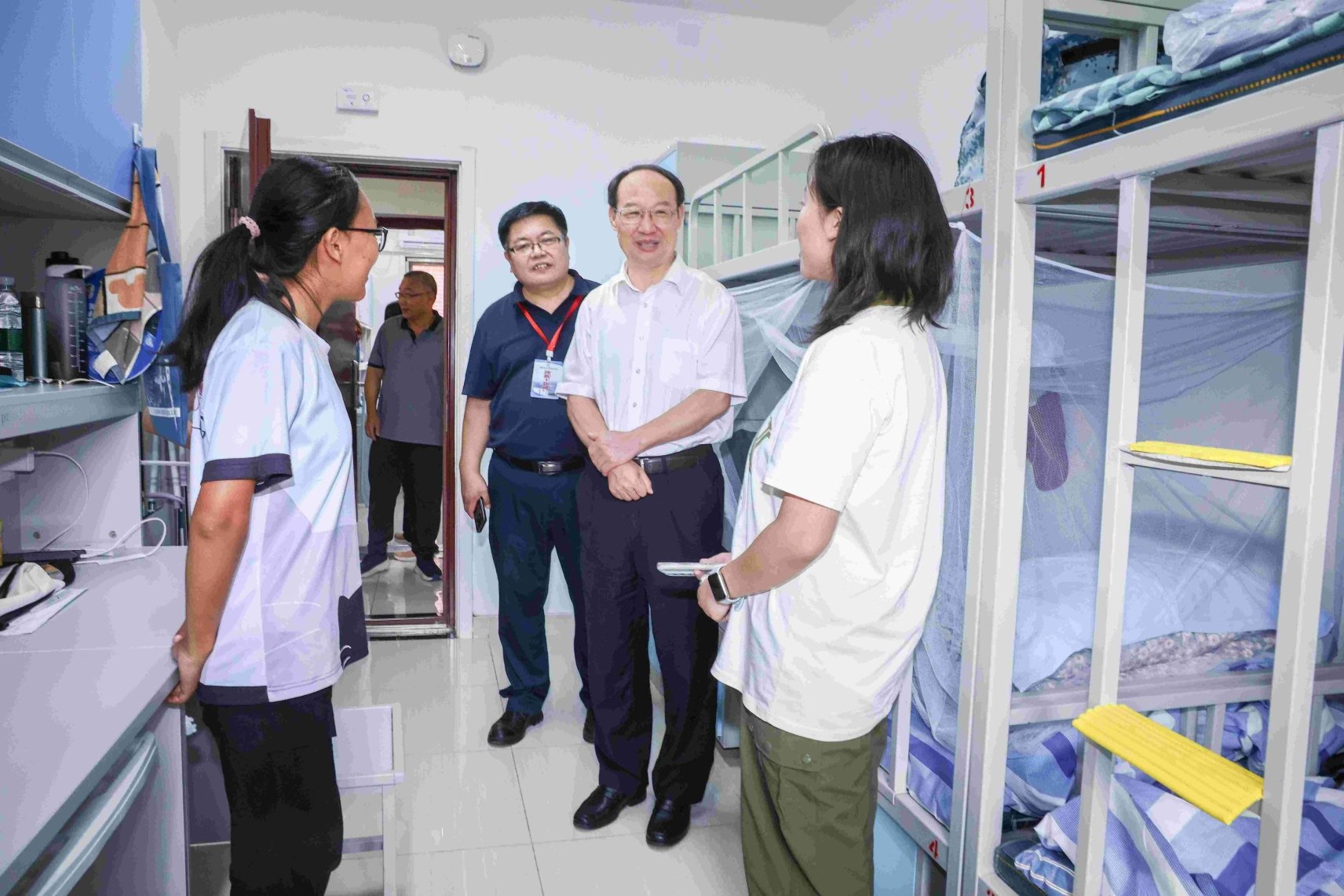 8月26日中午,校党委书记呼文亮专程来到绅士漫画 迎新现场指导工作,逐一走访各学系、各部门迎新站点、学生宿舍和绅士漫画 餐厅,亲切看望新生,慰问迎新工作人员、学生志愿者,实地检查指导绅士漫画 迎新保障工作,详细了解新生报到情况,对新生表示热切关心和欢迎。