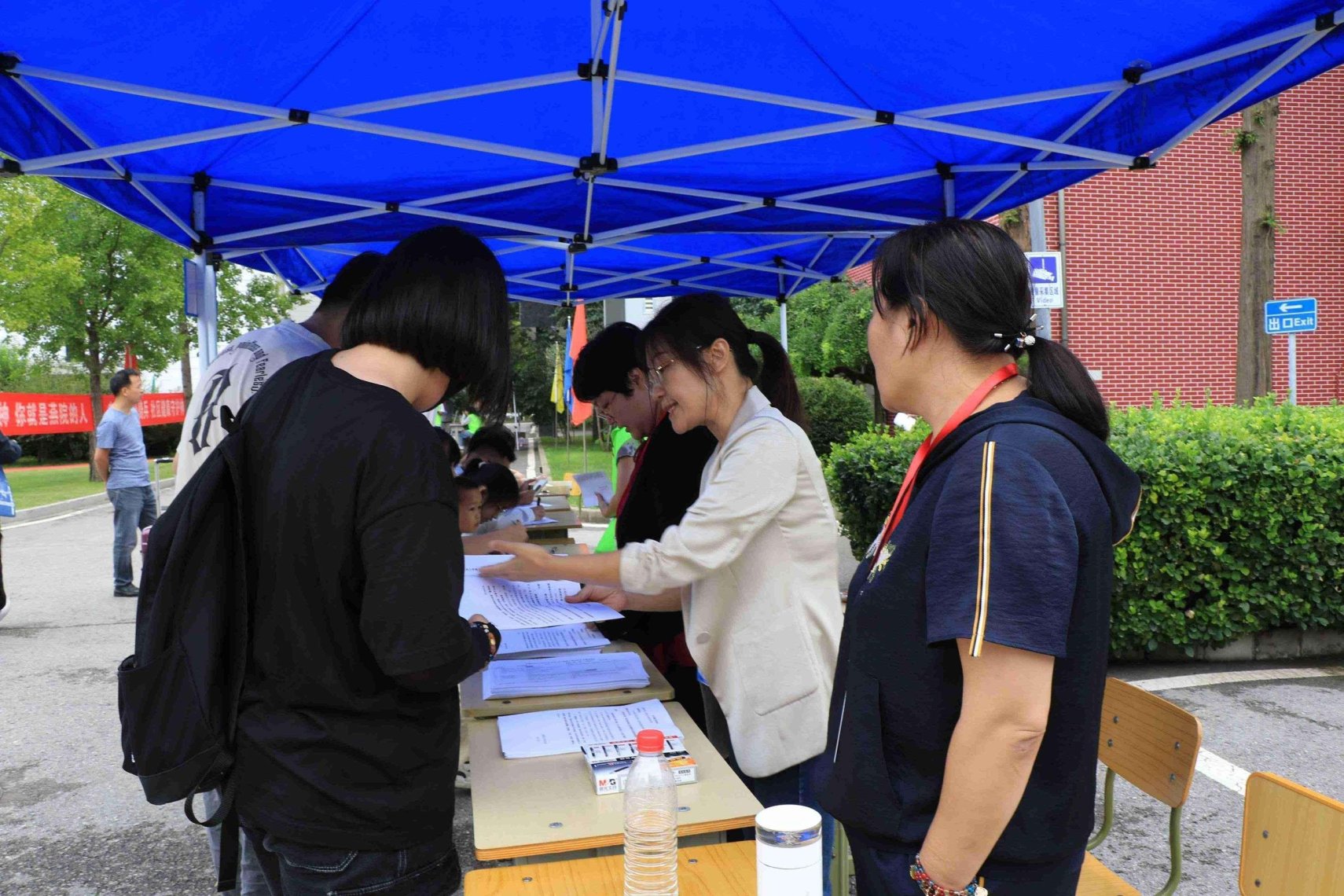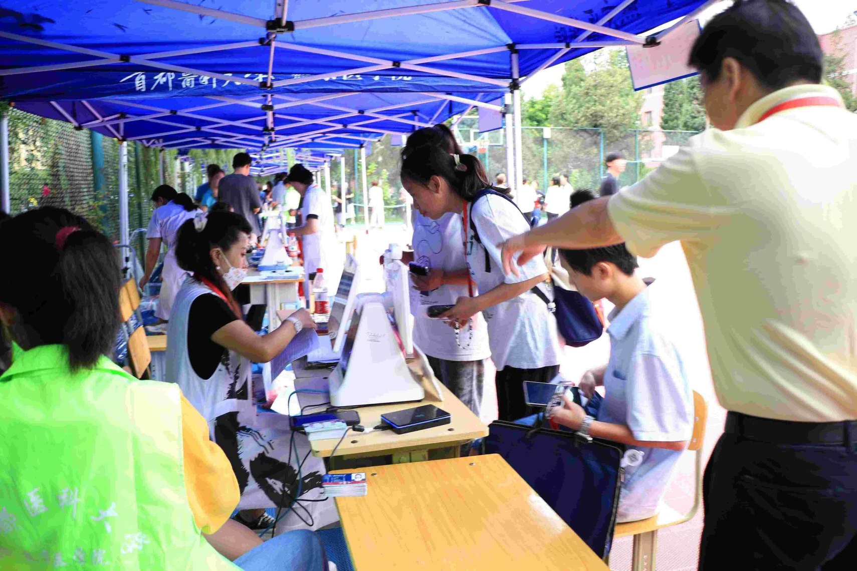 报到现场,各学系、各部门工作人员和志愿者早早做好准备,迎接新同学的到来。