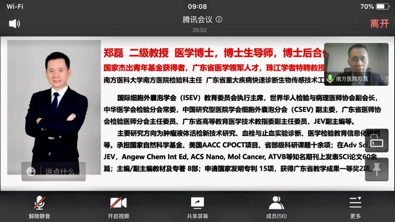 为促进一流专业建设,助力学术研究,11月13日,我院检验学学系邀请南方医科大学南方医院检验医学科主任、国家杰出青年基金获得者、珠江学者特聘教授、南粤优秀教师郑磊教授,为绅士漫画 师生带来有关细胞外囊泡研究的学术讲座。绅士漫画 院长杨红和100多名师生相聚云端,认真聆听了郑磊教授的精彩讲座,检验学学系主任高春艳主持。