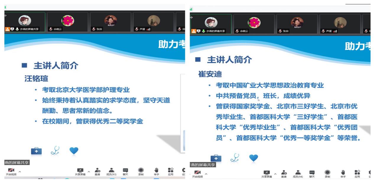 由于新冠肺炎疫情防控需要,护理学学系全体师生一直进行线上教学,虽然无法在校园相聚,但学系依然组织了丰富多彩的线上活动。5月17日,护理学学系邀请了2020级护理3+3+2贯通本科段学生崔安迪、汪铭暄与学弟、学妹一同展开了一场精彩的考研经验分享会。护理学学系全体教师与学系各年级护理专升本科、贯通3+3+2本科以及3+3中高职衔接专科段和3+3+2专科段的学生齐聚云端,共同探讨考研那些事。会议由护理学学系教学副主任许燕老师主持。