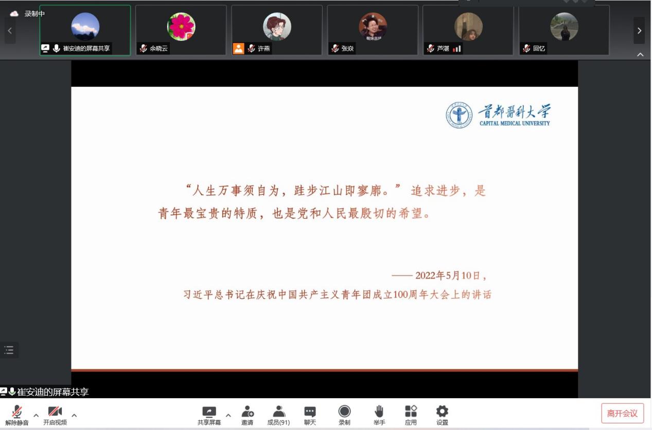 最后崔安迪同学以习近平总书记在庆祝中国共产主义青年团成立100周年大会上的讲话“人生万物须自为,跬步江山即寥廓”激励大家要无愧于自己,无愧于国家,无愧于我们所处的时代。